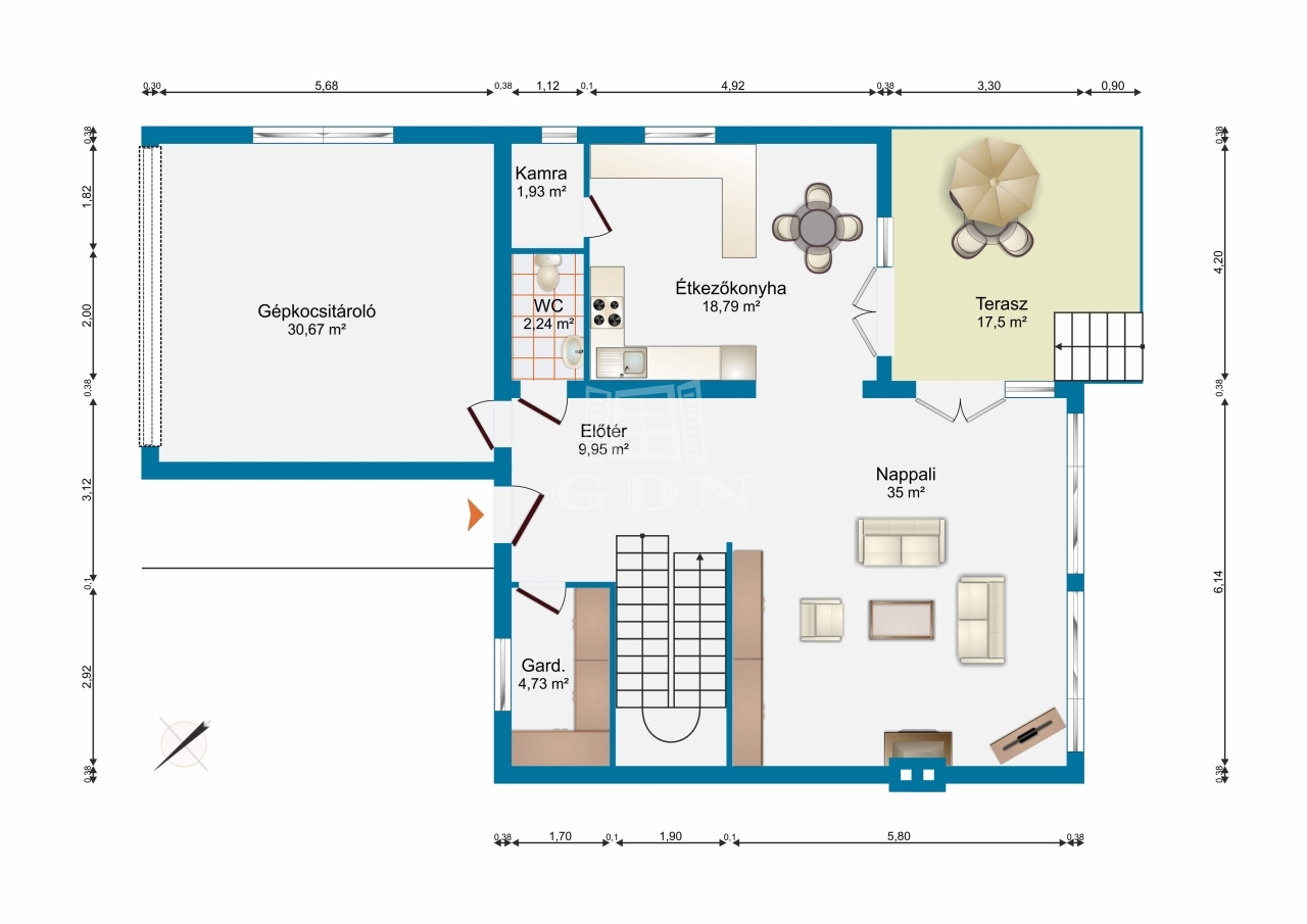 A társaságot összehozó terasz mérete 22 négyzetméter, remek helyszín a kikapcsolódáshoz és baráti összejövetelekhez.