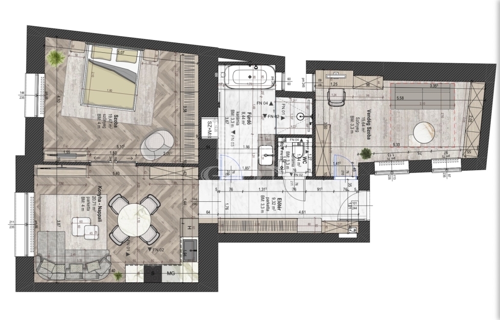 A lakásba lépve egy tágas előtérbe lépünk, ahol beépített tárolószekrény található, innen közelíthető meg a nappali, és a gépesített, jól felszerelt konyha. A nappaliból nyílik a nagyobb hálószoba, a kisebb háló az előtérből közelíthető meg, ablakai a belső udvarra néznek. A lakás a folyosó végén helyezkedik el, így az ablakok előtt nincs átmenő forgalom.