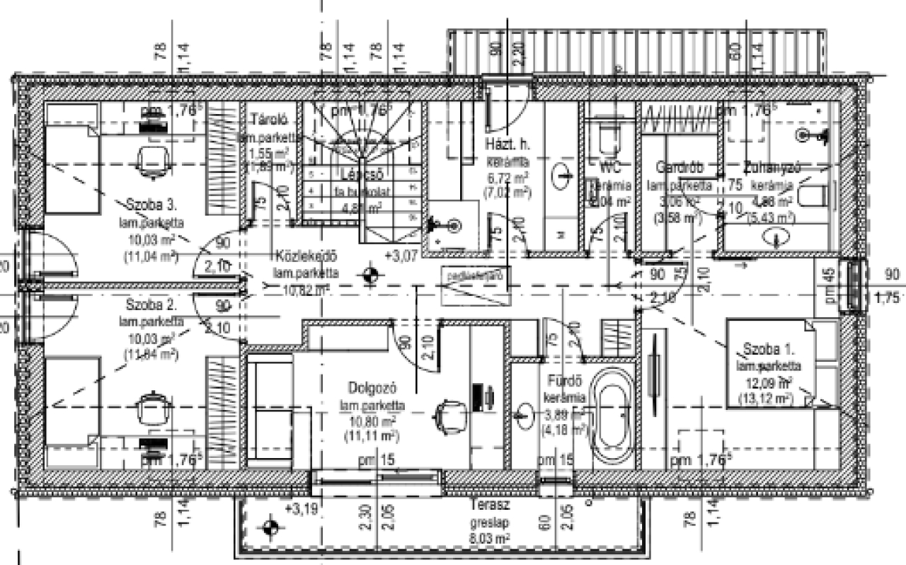 A nettó 145 m2 alapterületű otthonhoz 22,75 m2 garázs tartozik.
