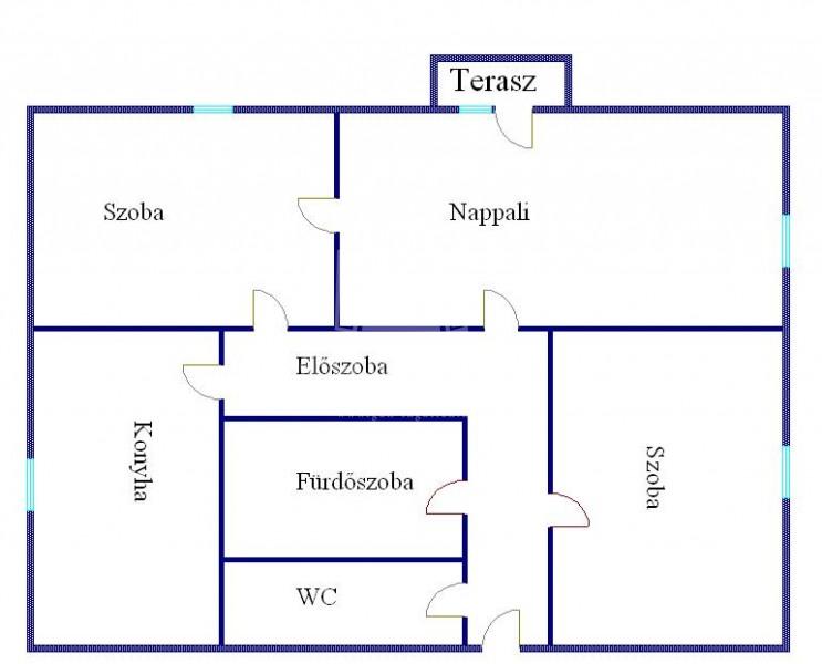Helyiségei: előszoba, konyha+étkező, WC, fürdőszoba+WC, nappali+2 szoba, erkély(3m2).