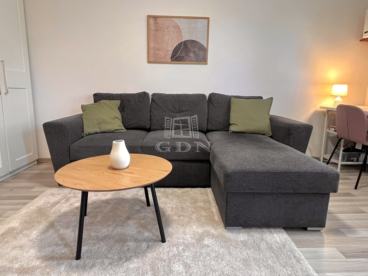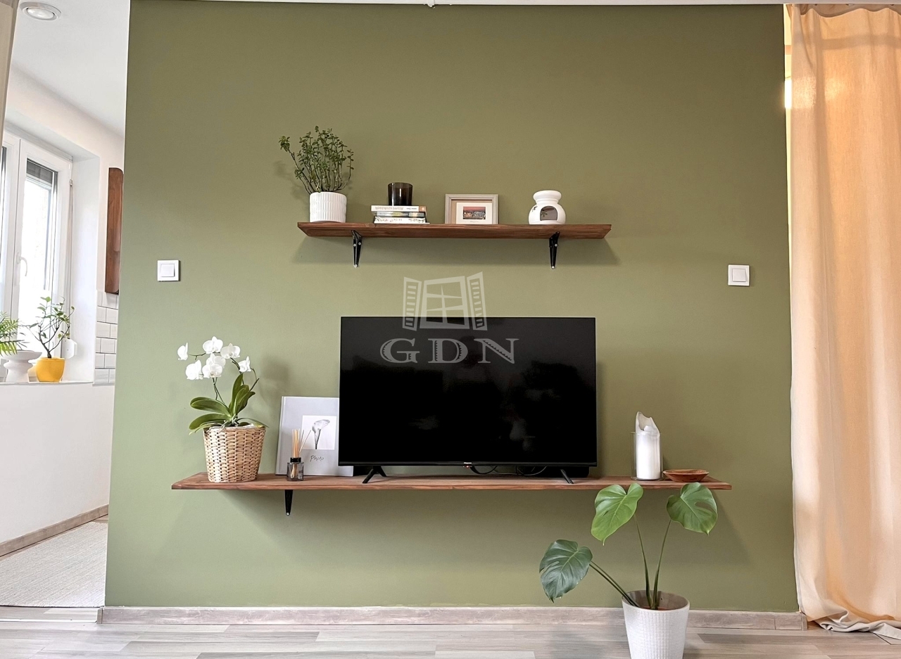 A lakás magasföldszinten található. Világos, egy szobás, tágas konyhával és fürdőszobával rendelkezik. Pár éve fel lett újítva, műanyag nyílászárókkal és TerraSec biztonsági ajtóval lett felszerelve.