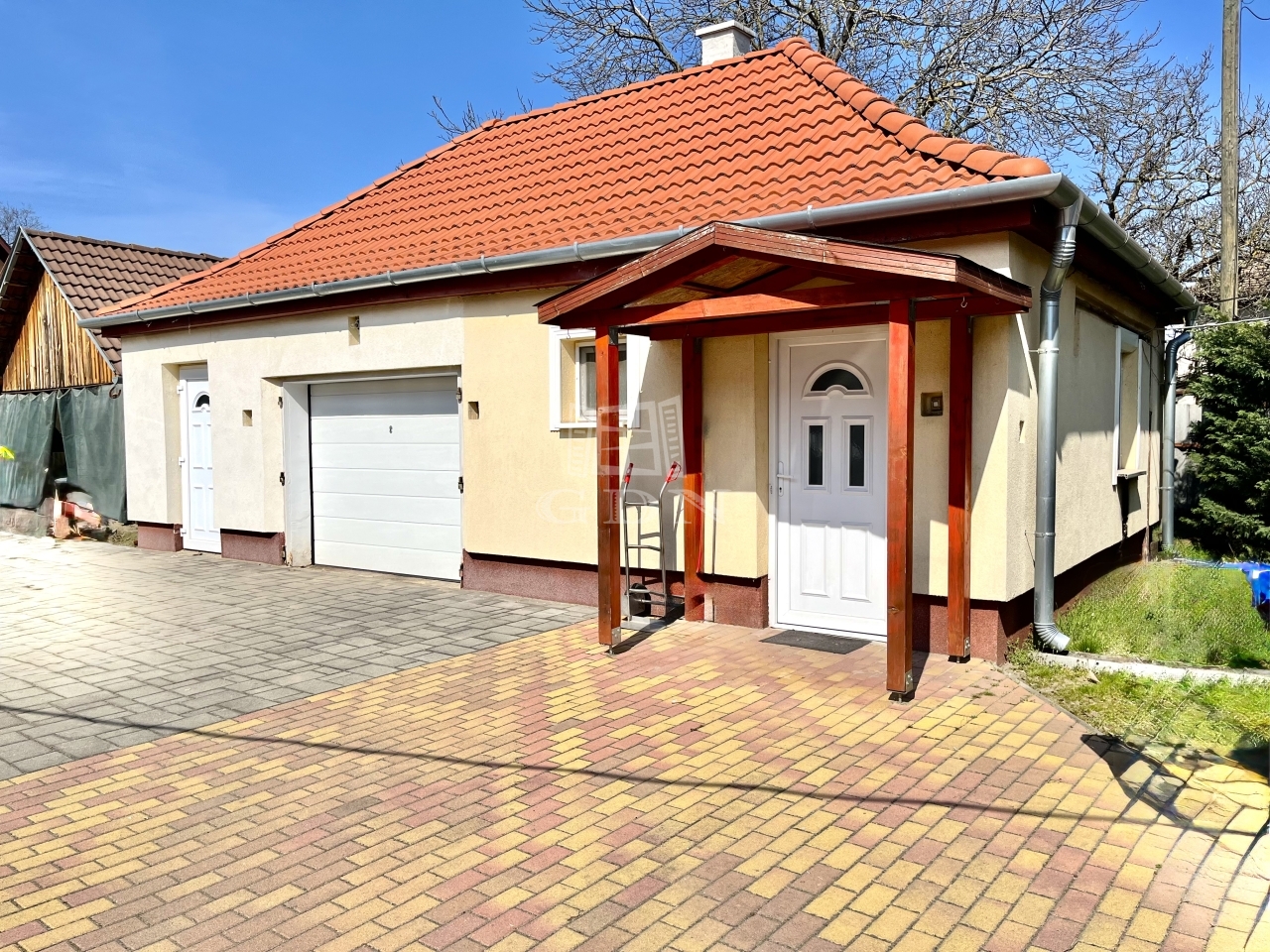 Udvara térkövezett, fedett kocsibeállóval ellátott, kertje pedig gyümölcsfákkal van telepítve.