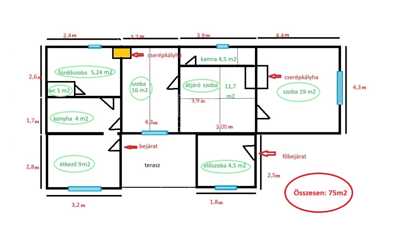 A ház 75 m2 alakítható terekkel rendelkezik: