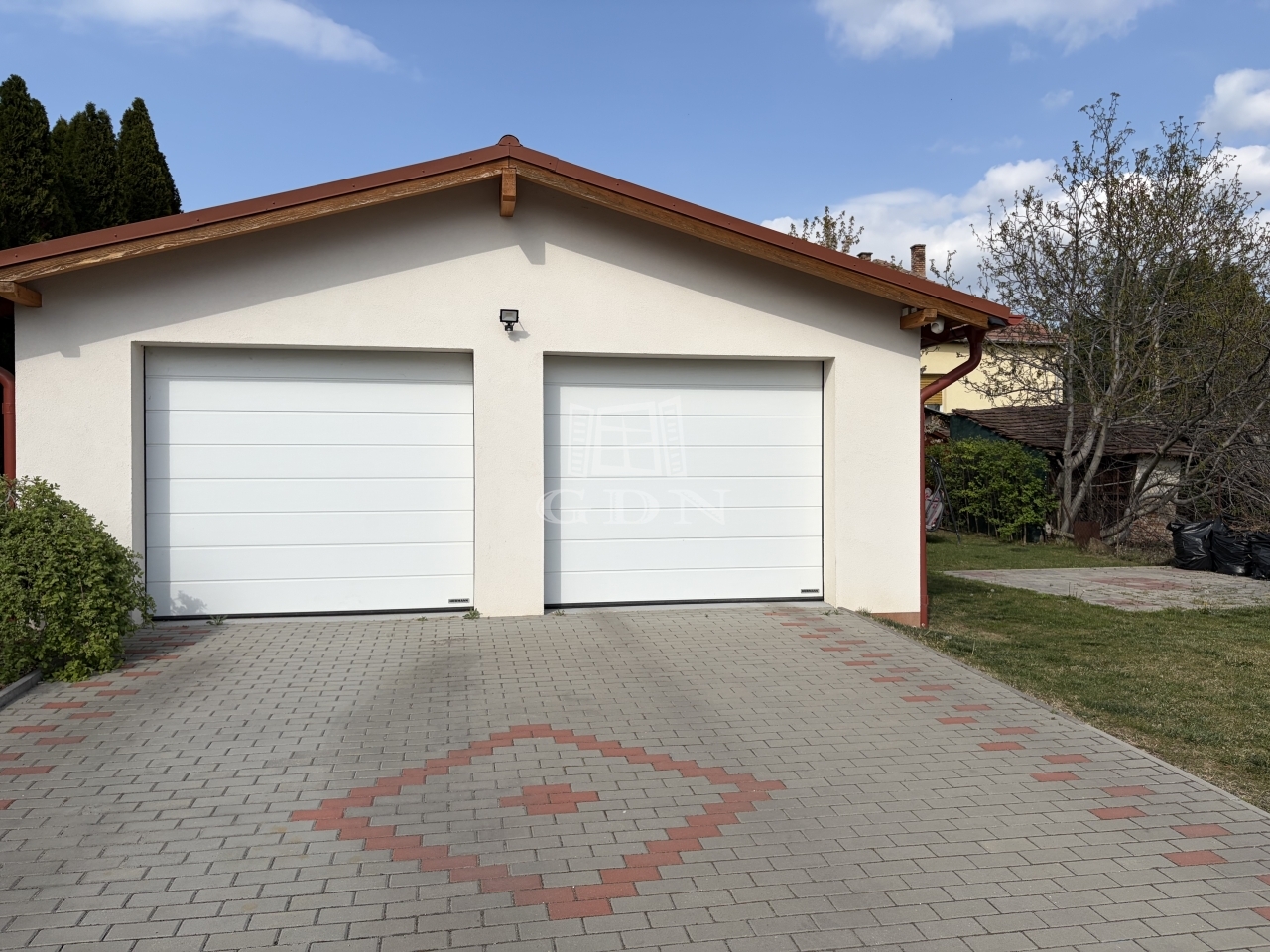 A 900 nm-es telken a kertbe érve, egy 2 beálllásáos garázsba lehet parkolni, melyet 4 éve építettek. A garázskapu elektromos, a garázs tégla szerkezetű.