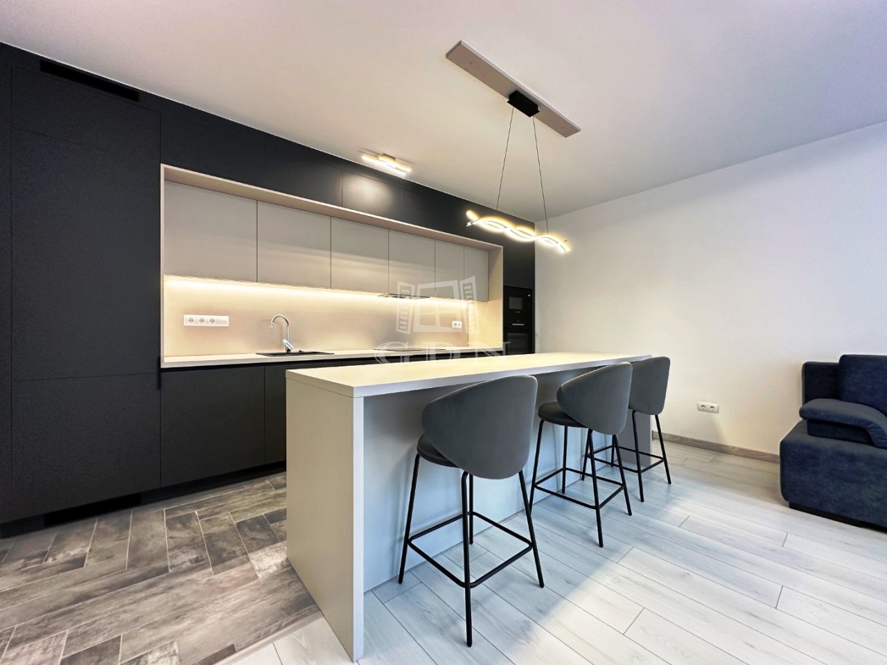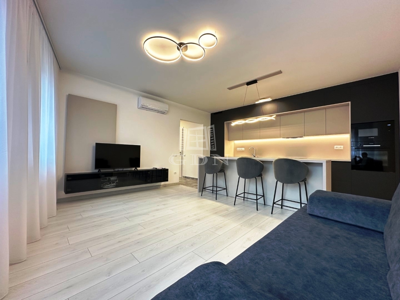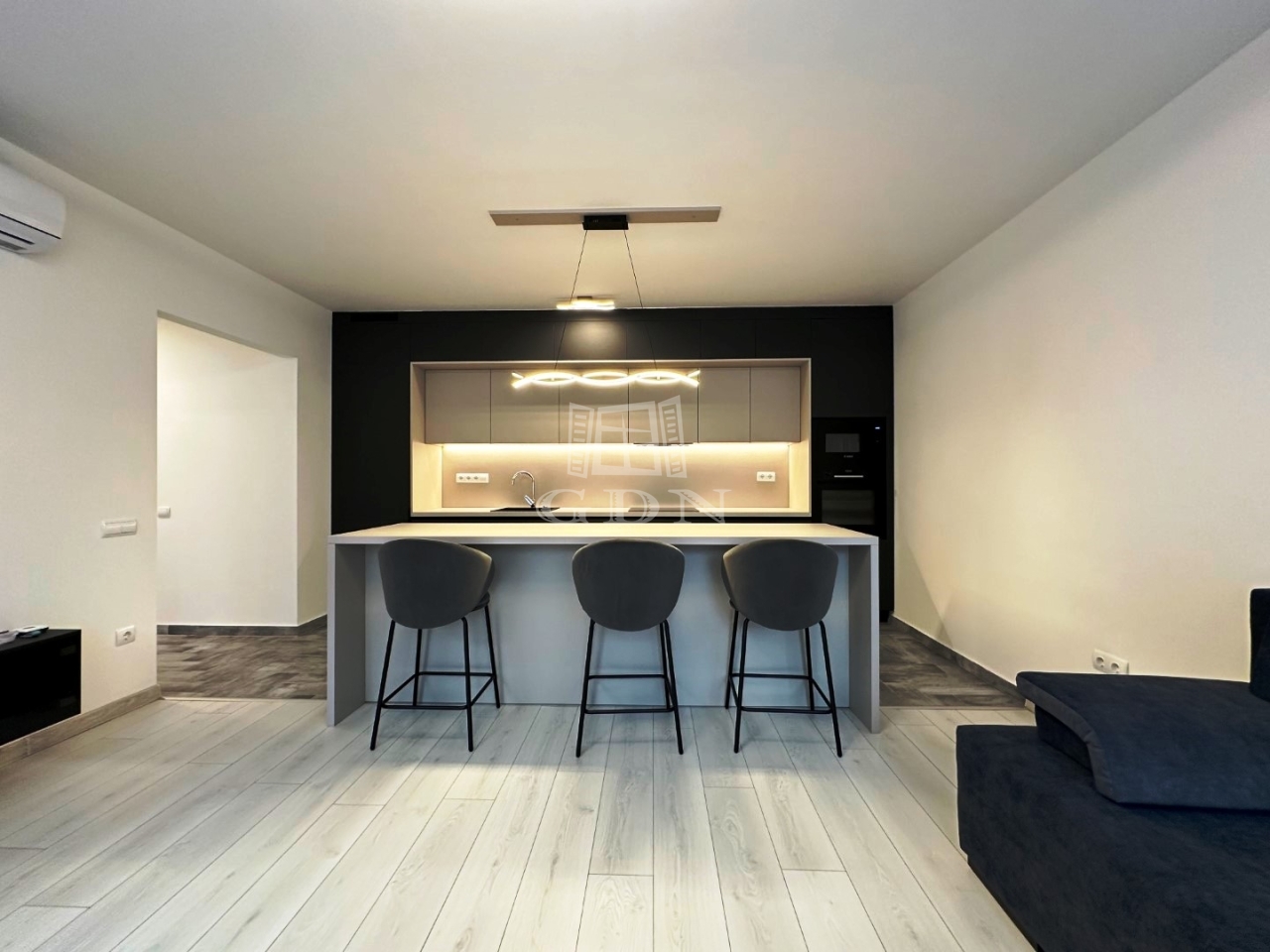 A beépített bútorok modernek, igényesek, a konyha gépekkel (kombi hűtő, főzőlap, sütő, mikrohullámú sütő, elszívó, mosogatógép) felszerelt.