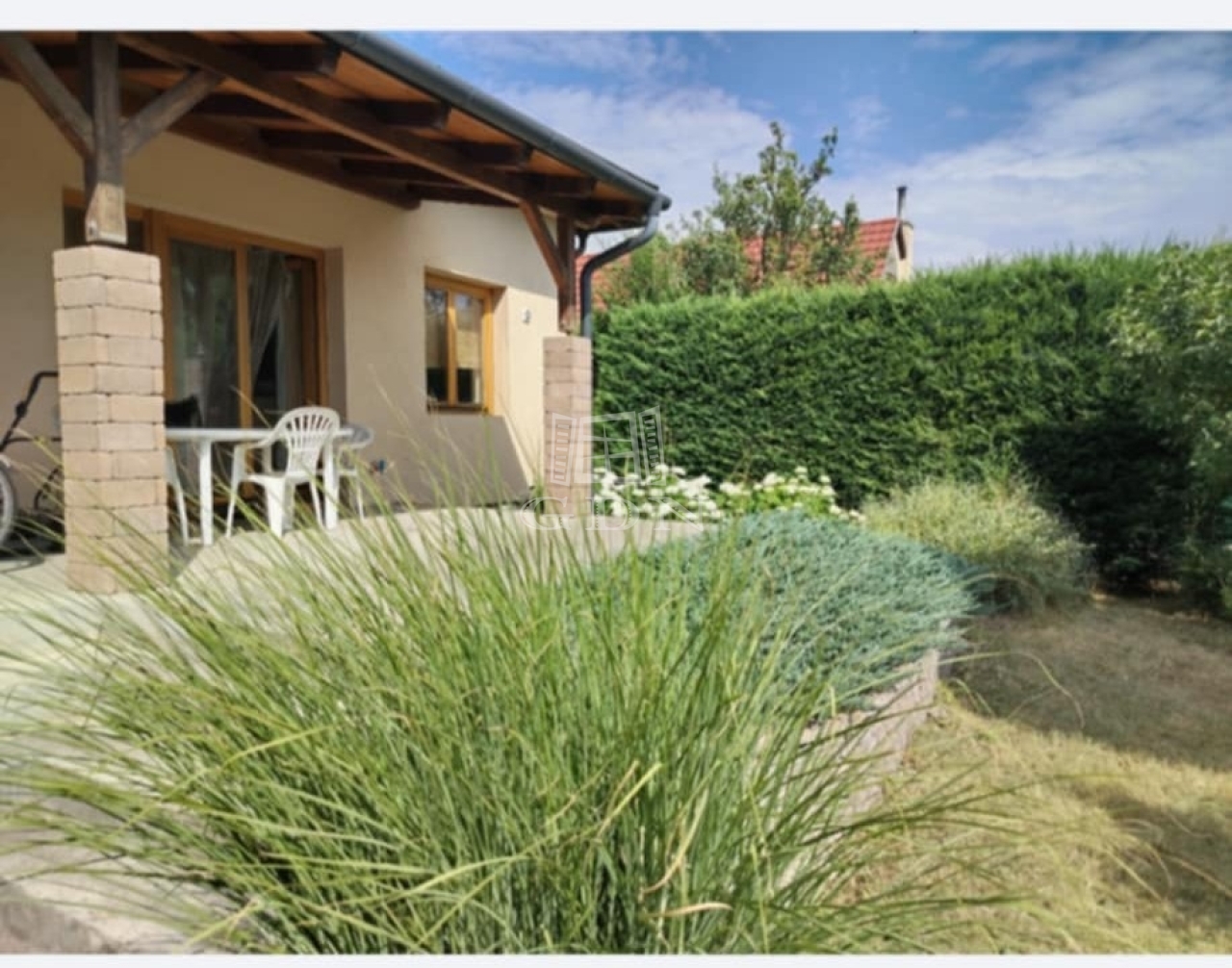 A ház körüli tágas, gondozott kert és a csendes, zöld környék ideális helyszínt kínál a pihenéshez. Emellett a környék összes fontos szolgáltatása és közlekedési lehetősége könnyen elérhető.