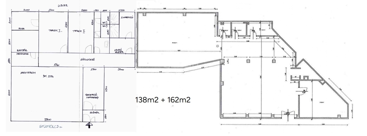 Az üzlethelyiség jelenleg két részre, egy 138m2 és egy 162m2 alapterületű egységre van bontva. Igény esetén összenyitva, egyben vagy megosztva, a jelenlegi állapotában is bérbe vehető.