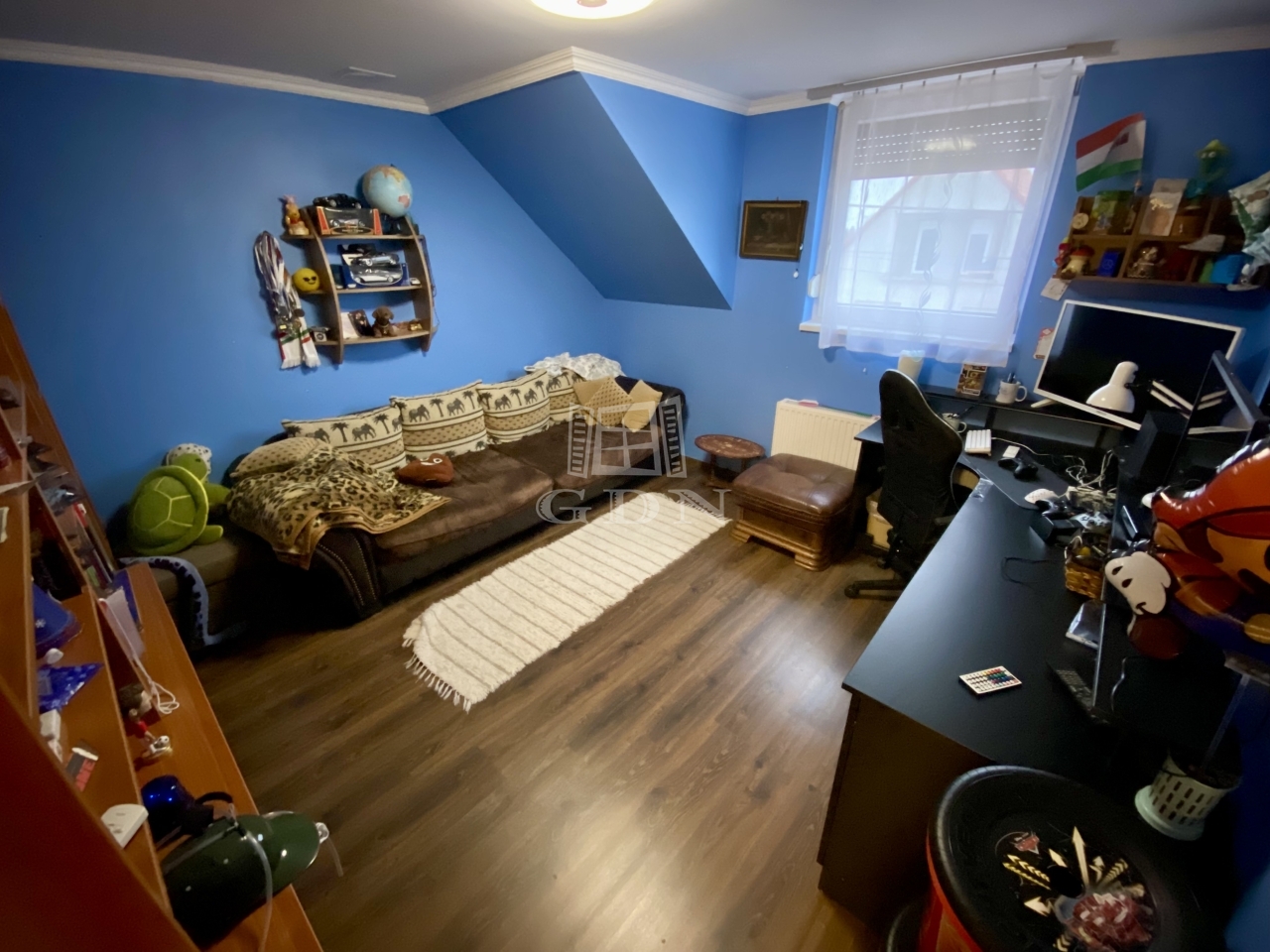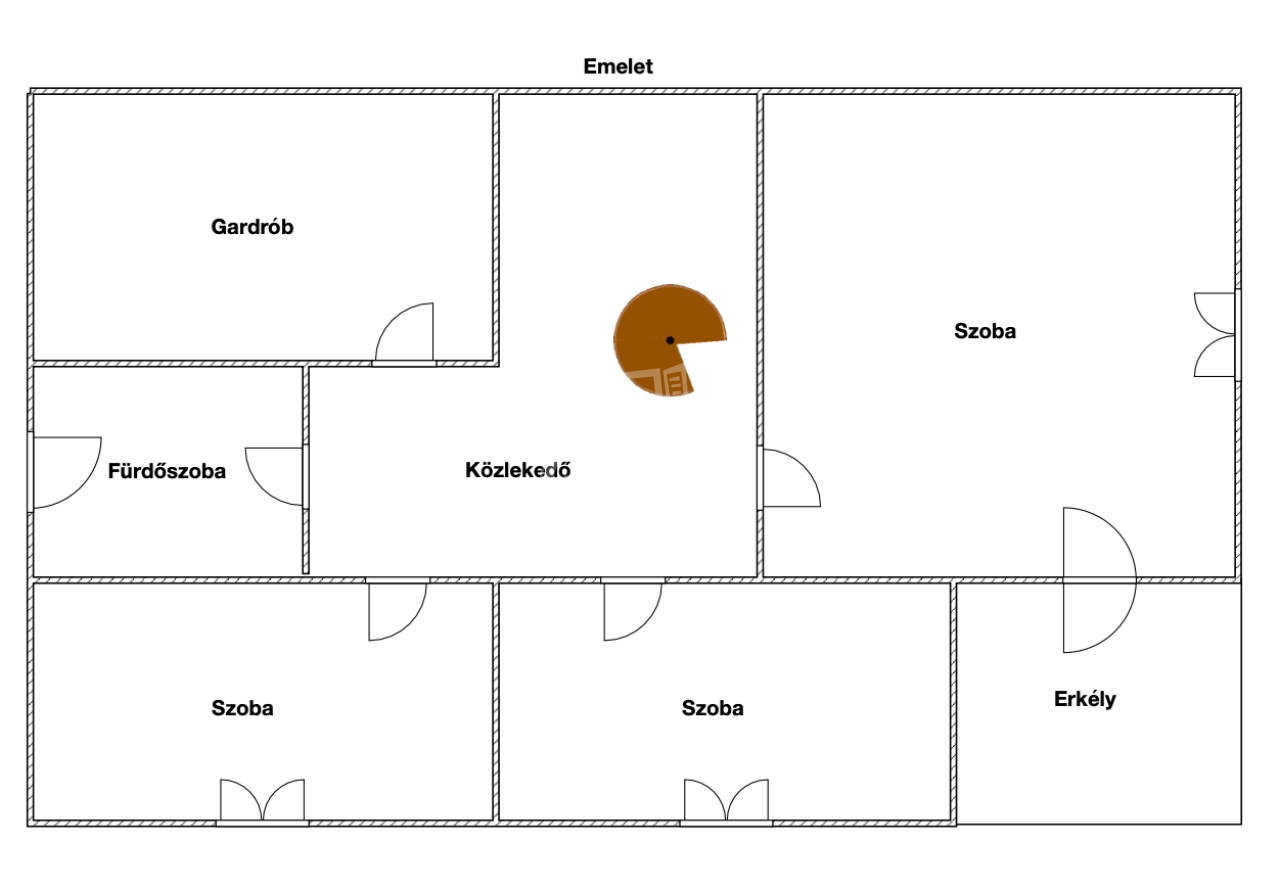 Az emelet három hálószobát kínál, így a privát terek jól elkülönülnek egymástól. A szinten egy zuhanyzós fürdő is található, valamint egy praktikus gardrób, amely a mindennapokat teszi kényelmesebbé.