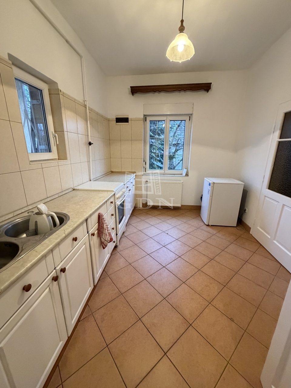 A nappali mellett található egy kényelmes méretű hálószoba, ez a szintén nagy méretű konyha étkezőből közelíthető meg jelenleg.