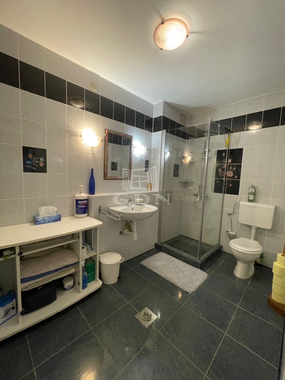 Itt kapott helyet továbbá egy háromágyas vendégszoba saját fürdővel (hivatalos szálláshelyként bejegyezve), egy dolgozószoba, valamint egy kertkapcsolatos második konyha, kamra, mosókonyha, pincelejáró és garázs is.