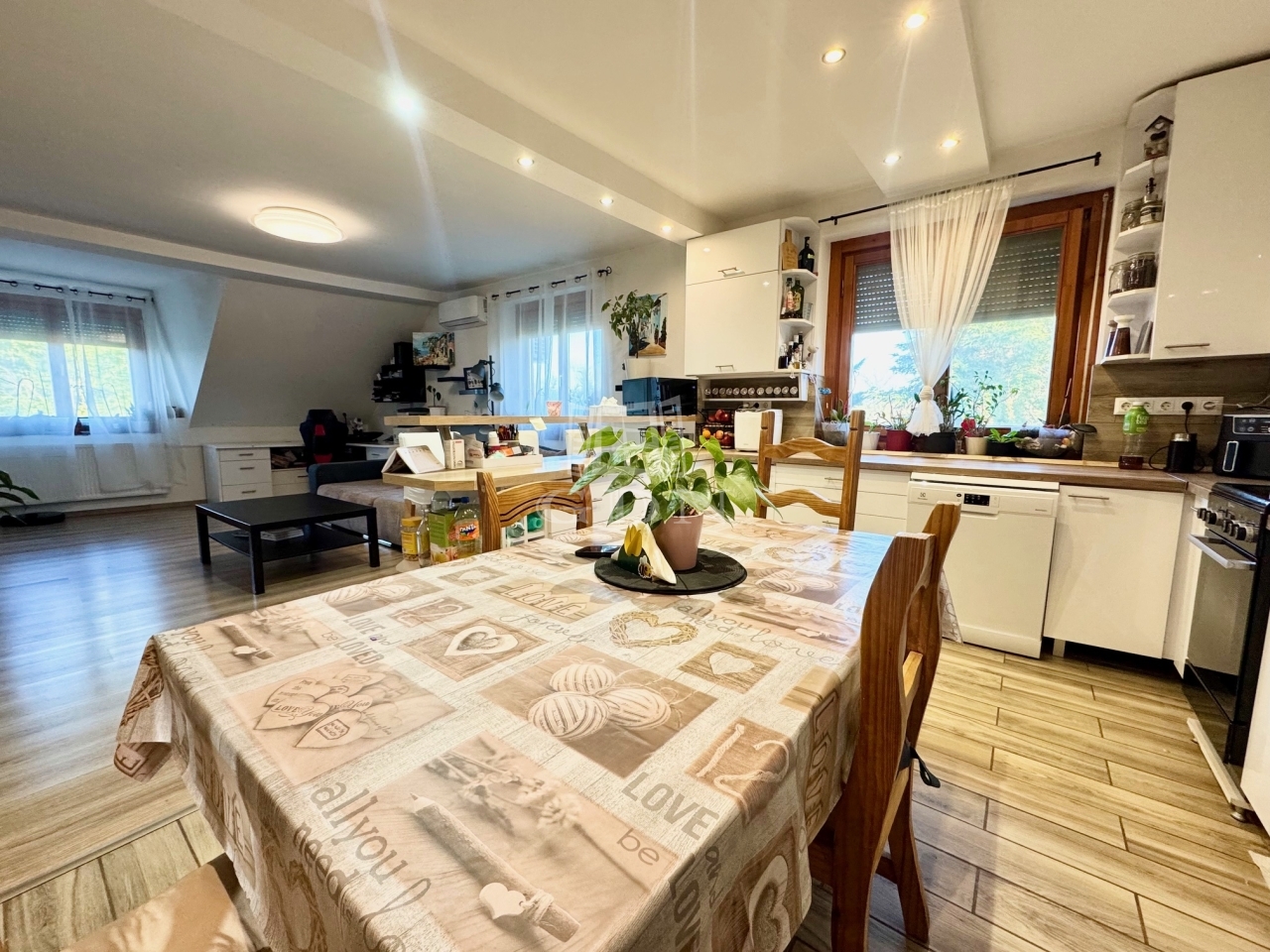 Göd-Felsőgöd kertvárosi környezetében, csendes, aszfaltozott utcában, kiváló közlekedés és ellátottság mellett, 536nm-es összközműves szinteltolásokkal tagolt telken, 1985-ben téglából épült, 3 szintes, (garázs/tároló, földszint, emelet) betonfödémes, 211nm-es lakóterületű, 6 szobás, dupla komfortos, dupla konyhás, kamrás, napos-világos Dk-i fekvésű, gázkazán és vegyestüzelésű kazán fűtésű, belső lépcsőházzal összekötött, de külön bejárattal rendelkező, szeparált, jó állapotú, 2017-ben részben felújított, klimatizált, rugalmasan birtokba vehető 2 generációs ikerház fél, beépített, gépesített konyhával, közvetlenül a házból is megközelíthető tárolóval és 2 gépkocsi számára alkalmas fűtött garázzsal, karbantartott, teraszos kialakítású gondozott kerttel, fúrt kúttal, kulturált környezetben eladó.