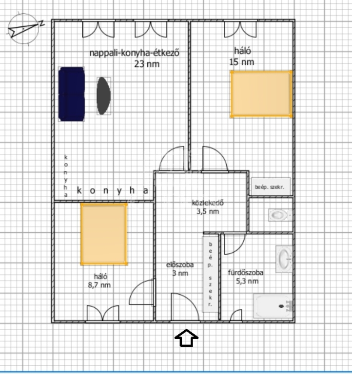 A lakás 60 nm-es, nappali + 2 háló szoba, fürdő - WC külön helyiségben.
