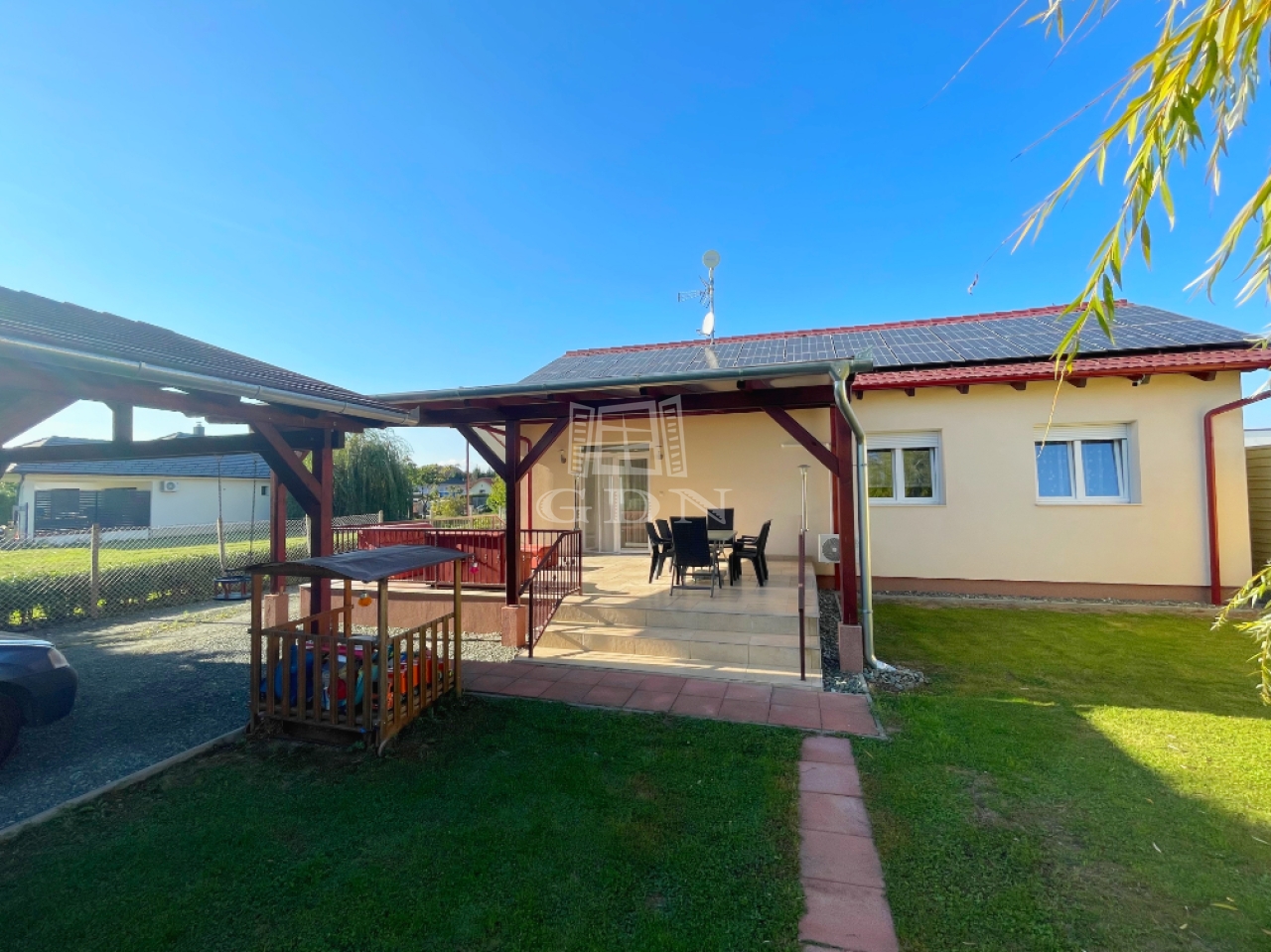 Szombathely herényi városrészén, magánútról megközelíthető 2017-ben, magas műszaki tartalommal épült családi ház várja új lakóit. Különlegessége, hogy akár a nagyiék is kötözhetnek. Külön nagy teraszról megközelíthető nappali-konyha, hálószoba, fürdő, wc elrendezésű, 38 m2-es kis ház külön megvásárolható. A hirdetésben szereplő ház 111 m2 nagyságú, három hálószobával rendelkezik. Kettő gardrób is kapcsolódik a szobákhoz. Nappalija tágas, nyugati tájolásának köszönhetően rendkívül világos. Konyhája kényelmét kamra szolgálja. Nagy méretű háztartási helyiségben található a lakás gépészete. A ház Silka falazó elemekből épült. Homlokzatára 2x12.5 cm multipor szigetelés, az aljzatba 3x5 cm lépésálló szigetelés, a födémre 2x20 cm szigetelés került. Energetikai szempontból kiváló az épület. Nyílászárói három rétegű üvegezéssel ellátott műanyag ablakok, alumínium redőnyökkel, szúnyoghálóval felszereltek. A tető Terran betoncseréppel fedett. A tetőre 15 kw teljesítményű napelemet szereltek, amely az ingatlan teljes villamos energia igényén kívül, a fűtést is ellátja. A helyiségek klímája külön termosztátokkal szabályozhatók. A hálószobákban falfűtés, a nappaliba fal -és padlófűtés, a fürdőkbe fal- és padlófűtésen kívül törölköző szárítós radiátorok kerültek. Az ingatlan dupla komfortos, tusolós és kádas fürdőszobáiban elszívók segítik a páramentesítést. A ház 36 m2-es fedett terasszal kapcsolódik a kerthez.