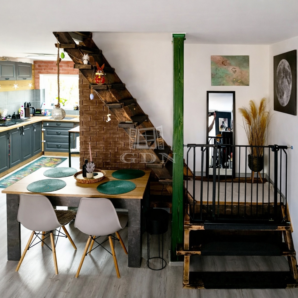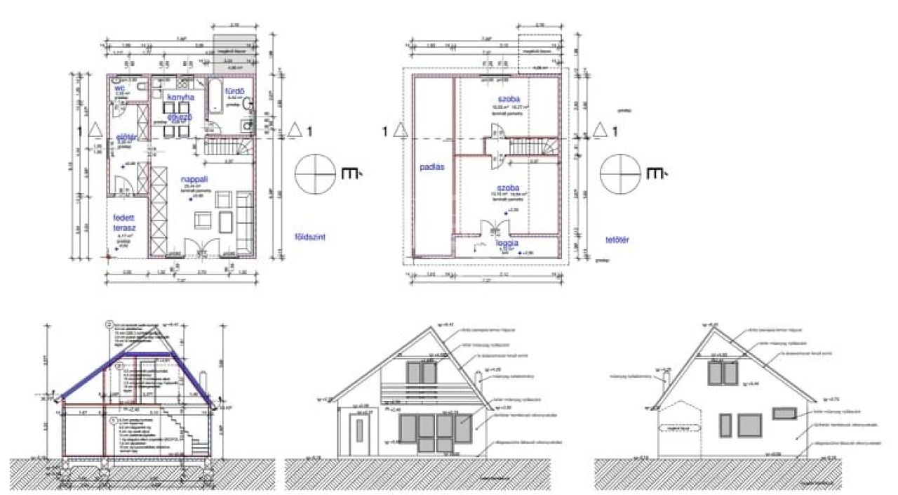 A földszinten található előszoba, nappali, konyha, fürdőszoba. A tetőtérben kapott helyet a két hálószoba.