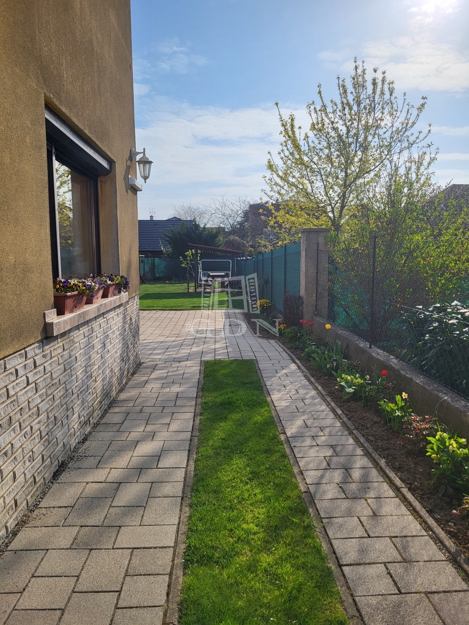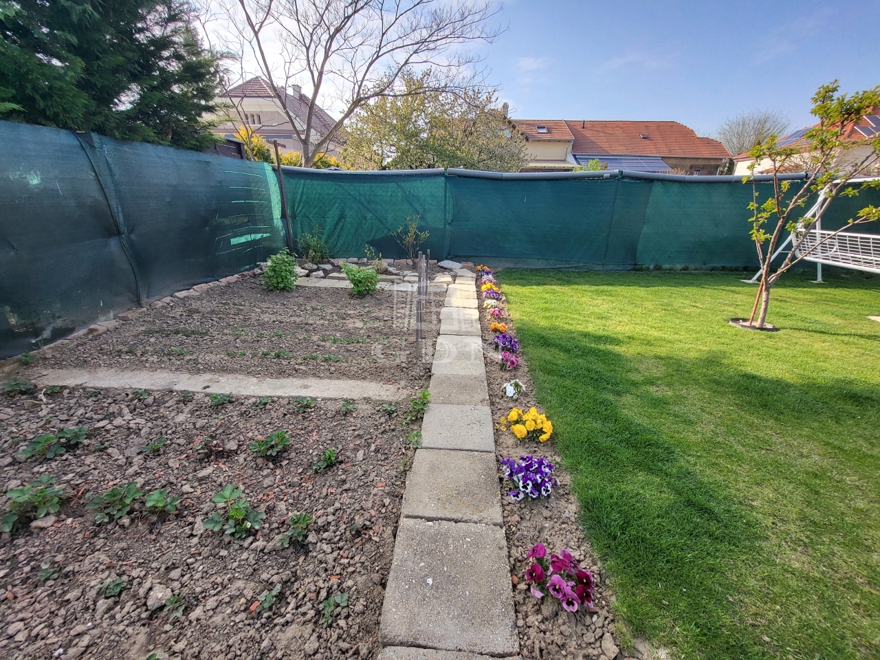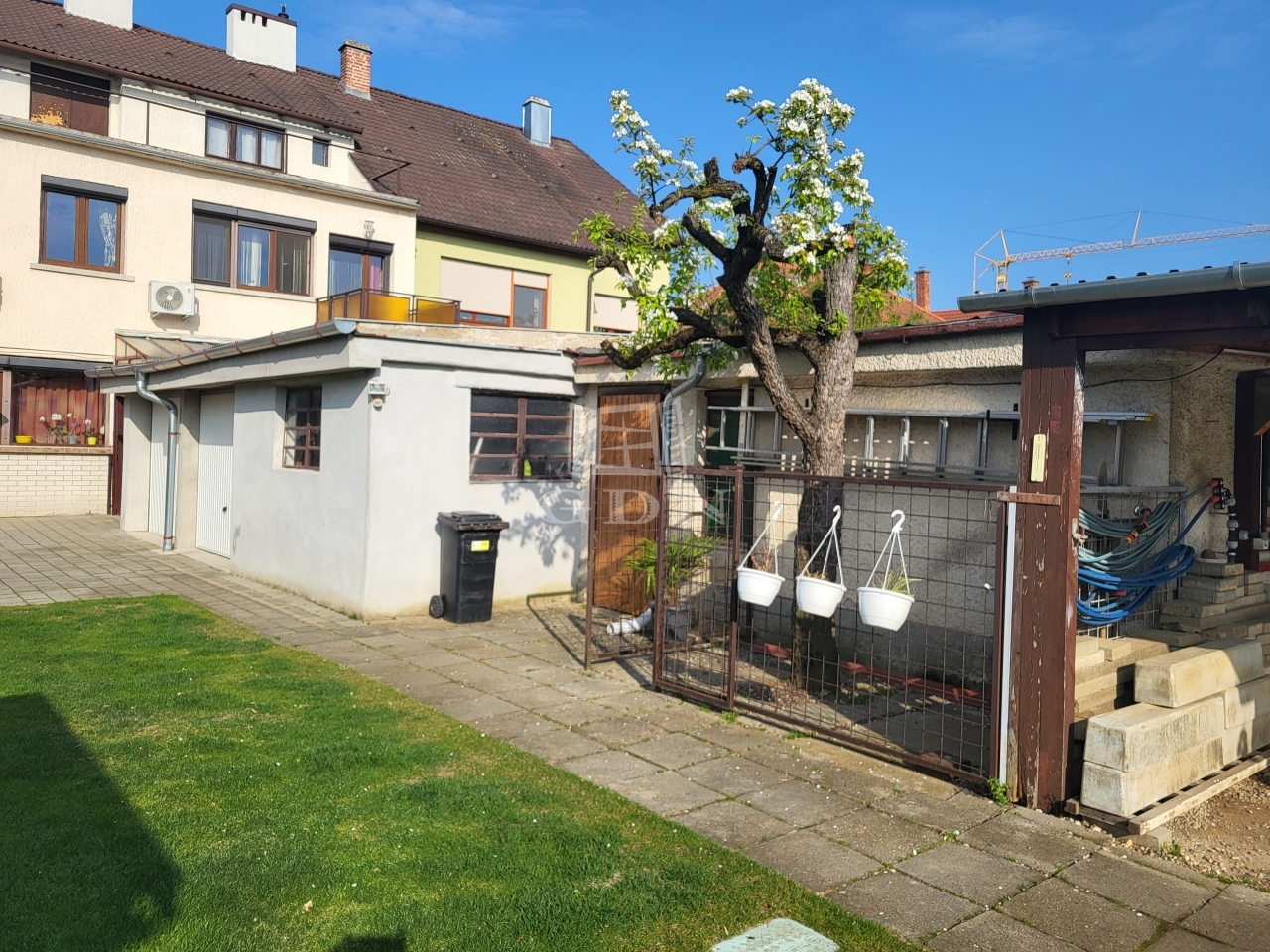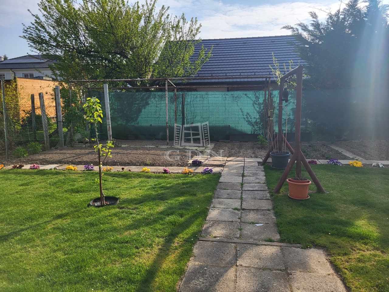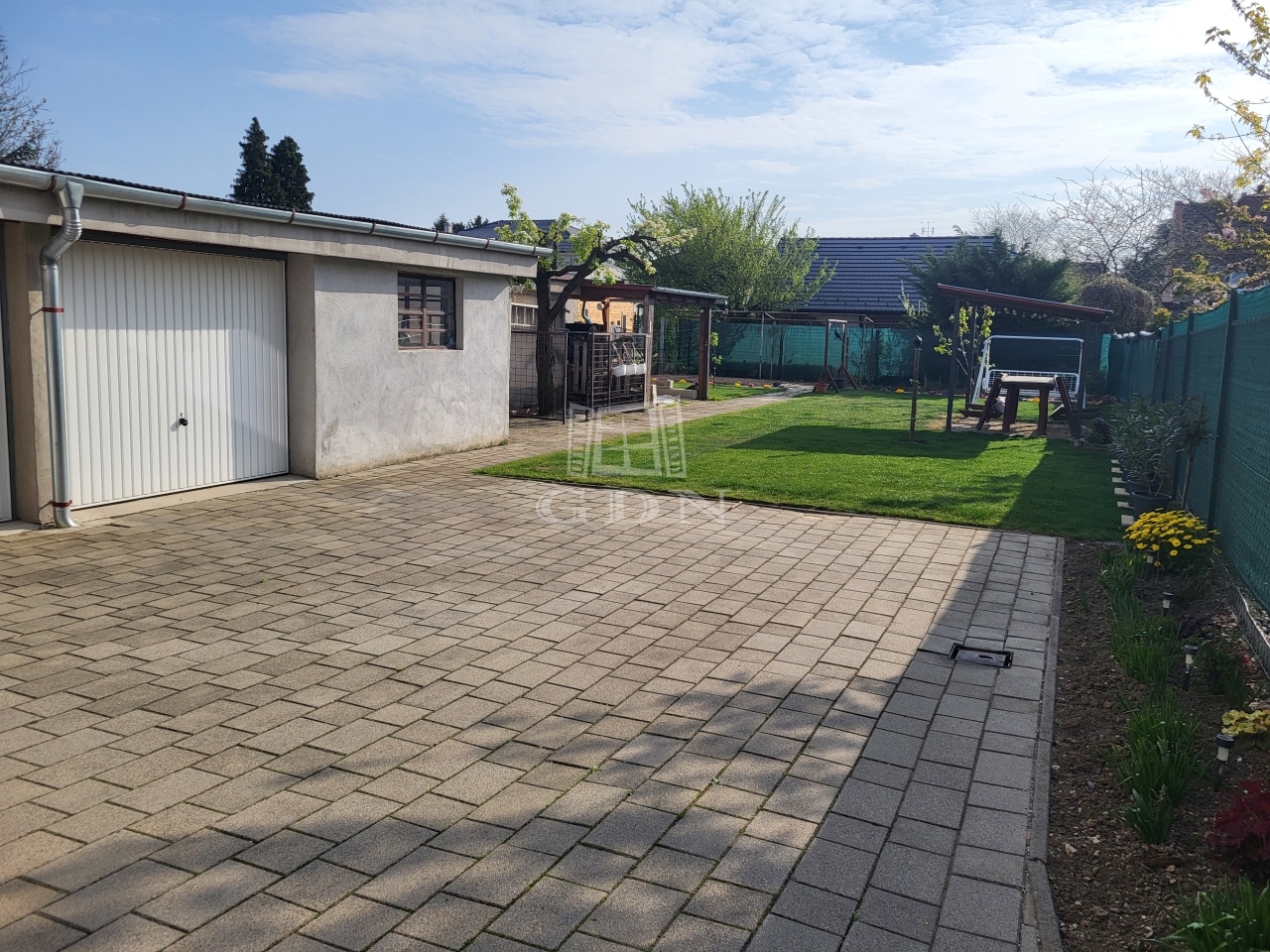 Az udvaron a ház folytatásában található a dupla garázs, kettő db tároló. Kertje szépen gondozott.