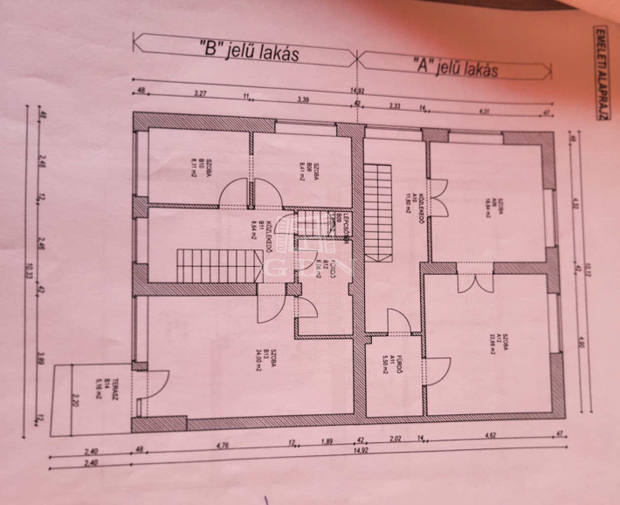 Emelet : lépcsőtér,három szoba, közlekedő, fürdő, erkély