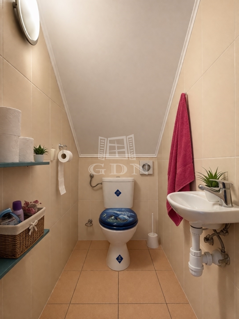 A földszinten (111m2) előszoba, közlekedő, konyha, vendég WC, 3 szoba, gardrób, két fürdőszoba, mosókonyha, kazánhelyiség (külön bejárattal) került kialakításra. A házhoz kapcsolódik egy ~30m2-es, boltíves pince is.